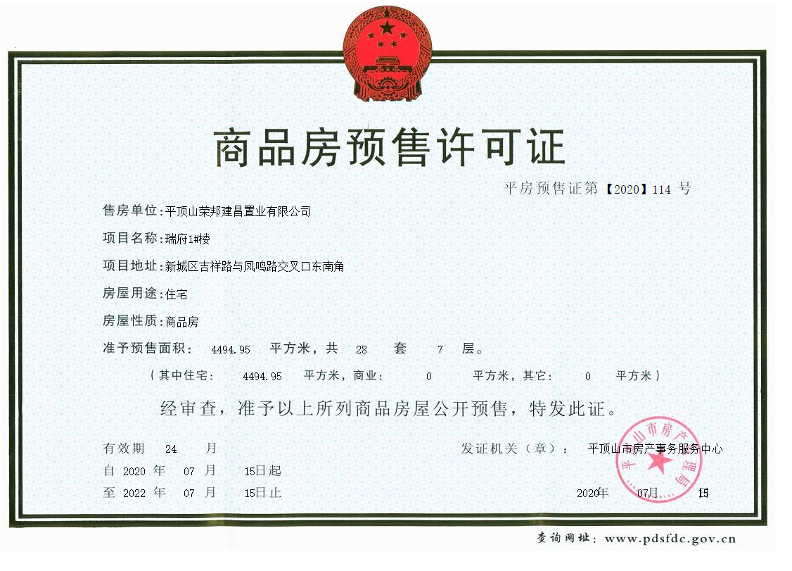 - 平房预售证第【2020】114号 详情发证时间 2020-07-15绑定楼栋瑞府1#楼证件照片