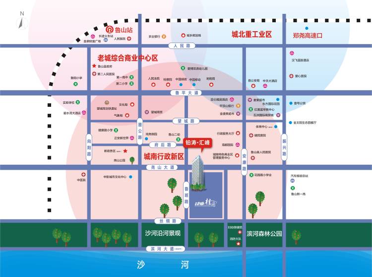 项目位于城南新区核心位置,是县委县政府重点打造的城市经济以及生活中心,紧临尧山大道,尧山大道是双向八车道的形象大道,是县委县政府重点打造的“黄金经济”走廊,是鲁山县的一张名片,而本项目就位于这条“黄金经济”走廊上的核心位置。项目周围,教育机构林立,往北200米是鲁山县二幼,往西不远处是鲁阳中学和健康路小学,往东300米是花园路小学,学校氛围浓厚。