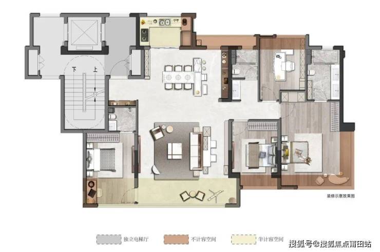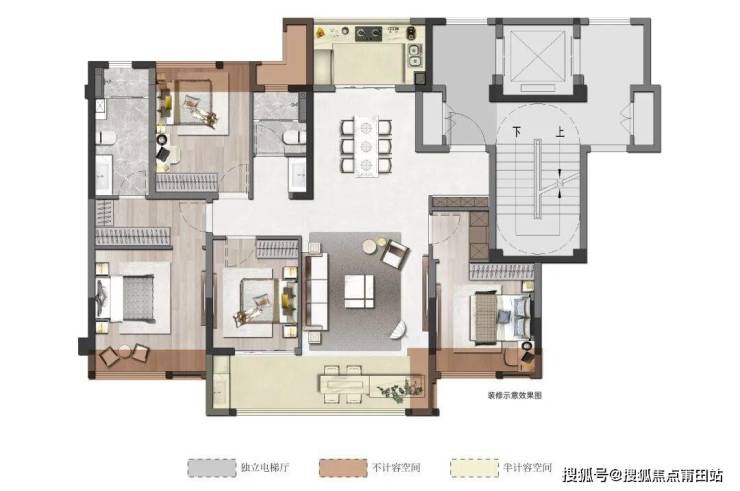 “南向四开间、三房朝南”格局,配备类独立电梯厅与双玄关,归家仪式感与私密性兼具。南北通透的全明餐厅衔接约38.8㎡阔绰方厅,家庭互动、宴客社交皆从容舒展。面积实得率远超常见新规户型,空间实用性更强。