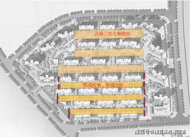 在景观空间上通过大尺度的建筑间距,留出开阔的庭院空间,并通过建筑围合、景观轴线、步行路径等元素将公共空间划分为不同等级的院落庭院,形成“公共—半私密—私密”的院落空间;在交通动线上整个社区采用人车分流的交通系统社区内还规划有主题式架空层泛会所、全龄化社区景观及主题式商业街区配套。