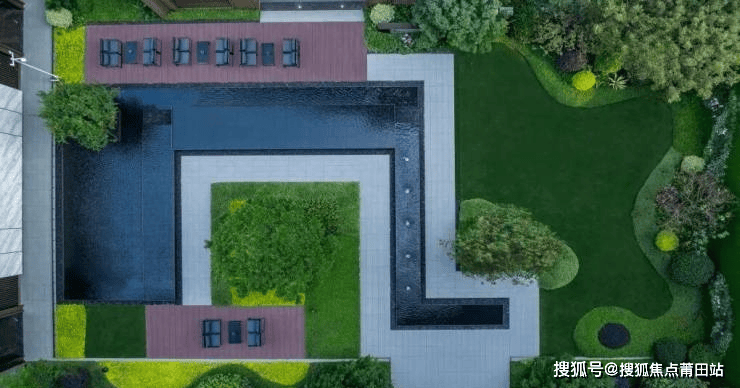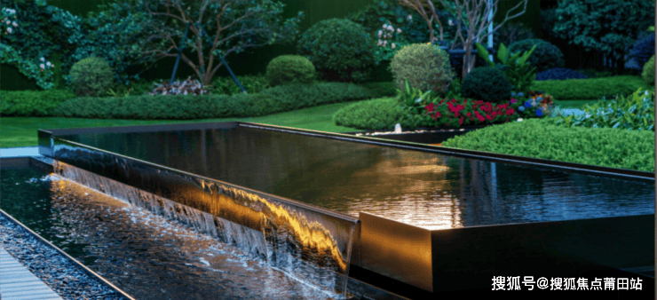 天光水境:几何线性水带,贯穿住区。水景沿黑色砾石的台阶潺潺而下,晨昏时分水雾氤氲,折射虹彩。