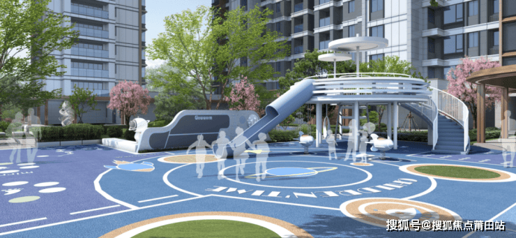 童梦守护:星球探索乐园内,透水塑胶地面柔软如茵,低矮灌木围合出安全边界,孩童奔跑嬉笑的身影与多巴胺色彩相映成趣。