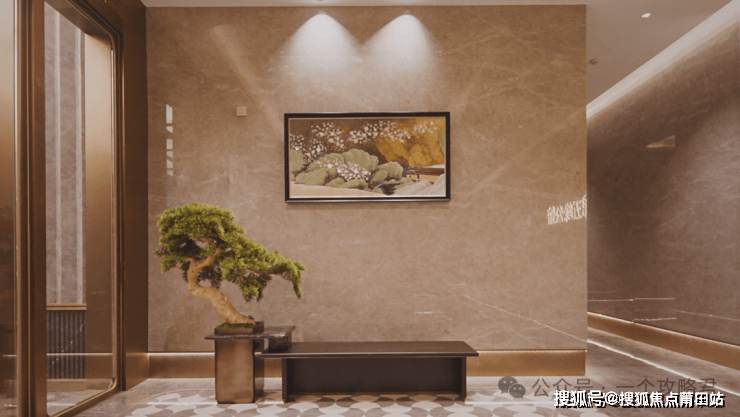 石材照壁与大面玻璃门相得益彰,质感拉满。