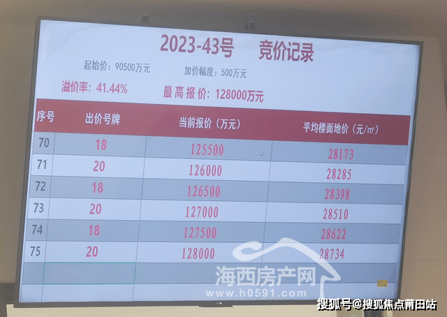 其中,经过75轮竞价福州兆裕房地产开发有限公司(厦门建发)以12.8竞得福州宗地2023-43号,楼面地价28734元/㎡,溢价率41.44%。