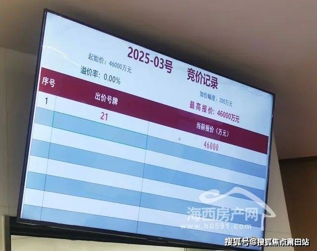 海西房产网(微信公众号:fjhxfcw)通过查询福州土地拍卖记录获悉,2025年3月28日,在福州市举行的年度首轮土地拍卖活动中,经过1轮竞价,21号竞买人福州嘉瑞房地产有限公司(国贸)以底价4.6亿竞得福州宗地2025-03号,楼面地价9914.94元/㎡。