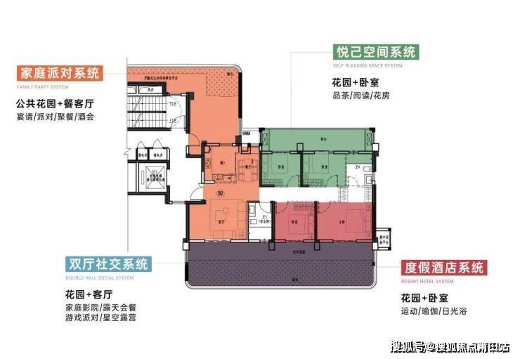 创新一:墅级尺度——区别于当下四代宅的LDKBG(餐客厨花园阳台),而是直接升级为LDKGY(餐客厨花园庭院),实现从“阳台”到“庭院”的升级;