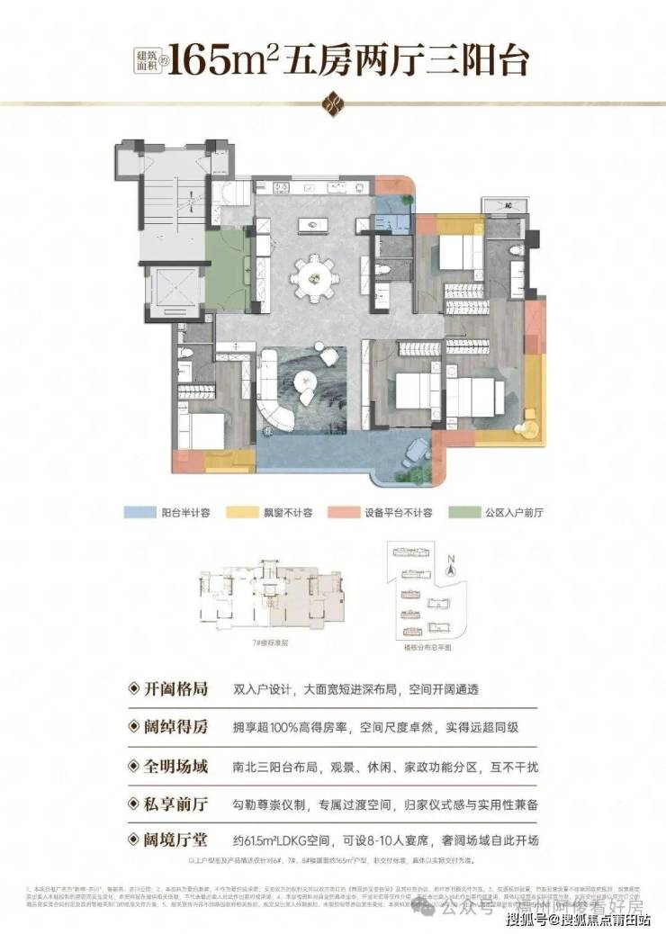 超高得房率,空间奢阔洋房得房率约 101%,近乎 “零公摊”;165㎡可做 4-5 房,横厅约 61.5㎡。