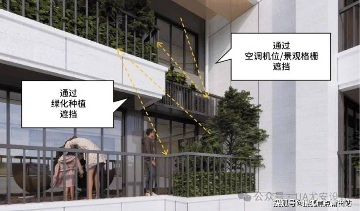 将绿化种植、景观格栅以及空调机位相结合,共同作用,使得下层的花园阳台尽量位于上层房间的视线盲区内,从而避免视线对视。
