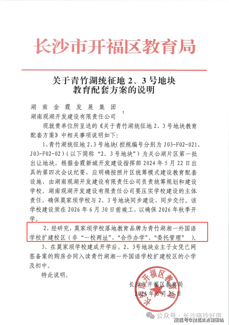 青竹湖湘一外国语学校东校区由湖南观湖开发建设有限责任公司建设,预计 2026年6月交付,2026年9月投入使用。