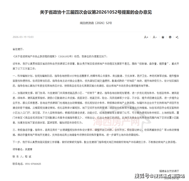 海西房产网(微信公众号:fjhxfcw)消息:3月19日,福建省自然资源厅官网刊发“关于省政协十三届四次会议第20261052号提案的会办意见”。