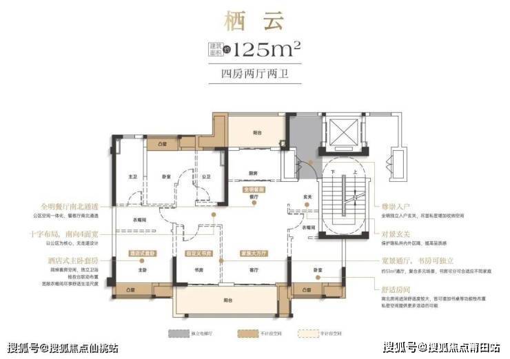 洋房产品主打125-149平方米的大平层,遵循大面宽、短进深的设计理念。例如125平方米户型可做到南向四开间,三房朝南一房朝北,餐客厅南北通透。149平方米户型则做出了市面上近170平方米的感受,做到4房+1房,3卫配置以及少承重墙的布局,使后期改造非常便利。