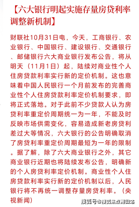 工商银行、农业银行、中国银行、建设银行、交通银行、邮储银行六大商业银行发布公告将从11月1日起陆续对商业性个人住房贷款利率实行新的定价机制▼▼▼