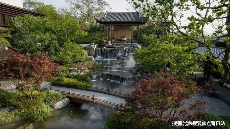 楼盘别墅区和洋房区是隔开的,别墅区打造有独立入园门户,中式飞檐翘角,搭配古铜色金属镂空大门,庄严中不失现代典雅风范,高端大气。跨过大门后,就是贯穿南北的中轴景观,一路归家,一路是品质、生活、美学的产品力展示。景观中轴上,涵盖曲水游廊、叠瀑石景、御水步桥、远山石径、云山亭等,已全部实景兑现。在这里慢行、赏景、观瀑、休憩……一步一景,步步不同景。