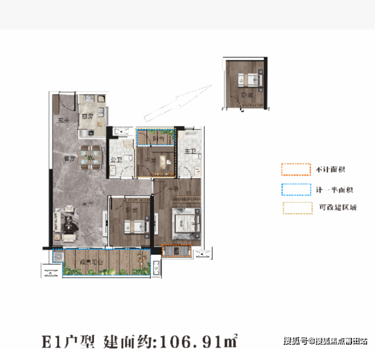 【E1 : 106.91㎡ 3房2厅2卫】