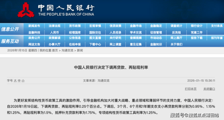 1月15日,中国人民银行官网发布《中国人民银行决定下调再贷款、再贴现利率》公告。