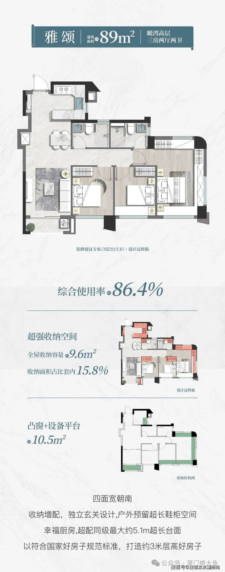 79㎡做全能类边户三房:虽是中间户,但做出了边套居住感,超大采光面与观景面。,层高3米,近9米的三大南向采光面,全屋约7.04㎡的收纳系统,户外玄关还可以做鞋柜使用,还有近7m²凸窗+生活阳台面积(相当于送了一个书房的面积),收纳空间拉满,实用性强大,综合得房率 83.45%。