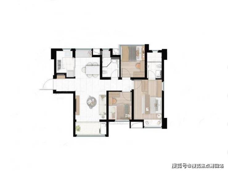 得房率超85%:80-106㎡三至四房户型,全明布局,无面积浪费。