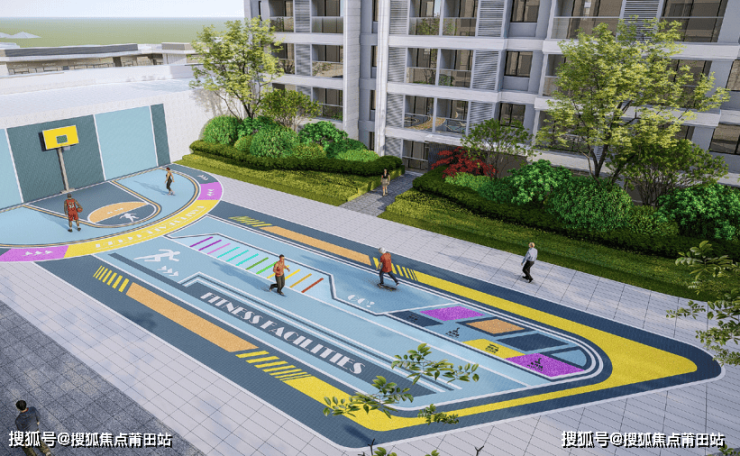 【全时段运动空间】楼下健身房、约7000㎡运动场、长约1400m跑道、篮球场。