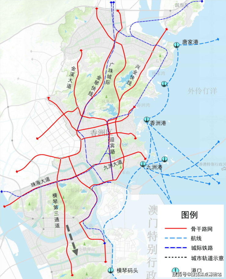 以香洲港、九洲港、唐家港和横琴码头四处路侧码头为锚点,积极引入城际轨道、城市轨道,完善衔接转换的高快速通道、片区微循环路网,优化至海岛的航线,来提升核心城市组团与海洋海岛的衔接效率,积极落实陆岛交通发展战略。