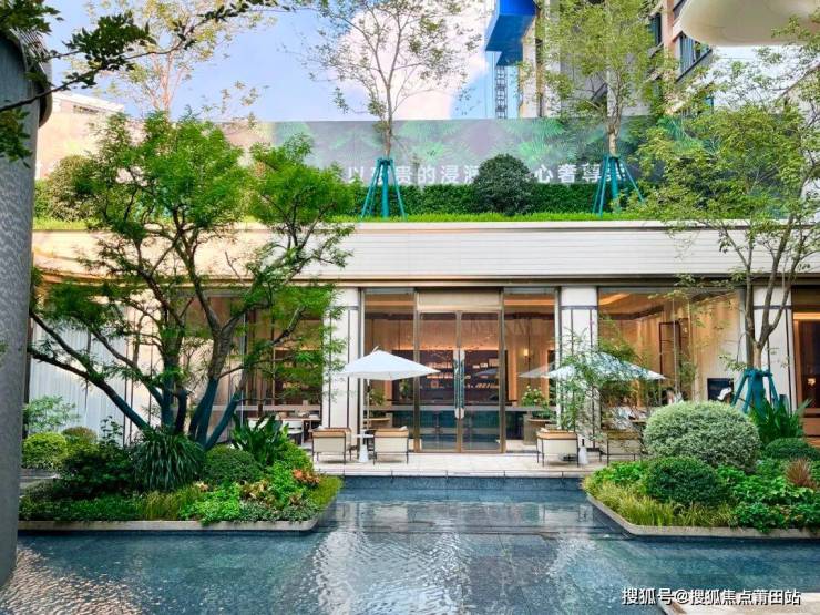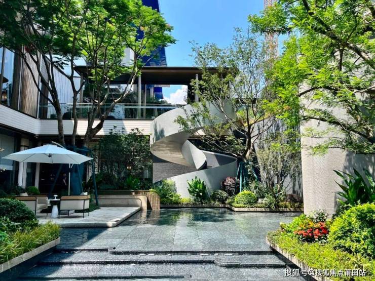 蓝翡翠奢石池底倒映水景,鱼鳞纹叠水景观旁,甄选的老桩凤凰木、庵摩勒、丛生乌桕等名贵树种,也将尊贵感和仪式感嵌入日常,整体空间呈现出高贵的静谧感。