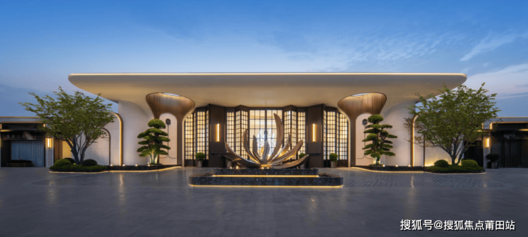 以深圳南山香格里拉酒店为设计灵感,入口两侧对称布置,整齐列阵。以蓝翡翠奢石为底座的景池,与“百鸟朝凤”纯铜雕塑相映成趣,开启归家之路的第一眼震撼。