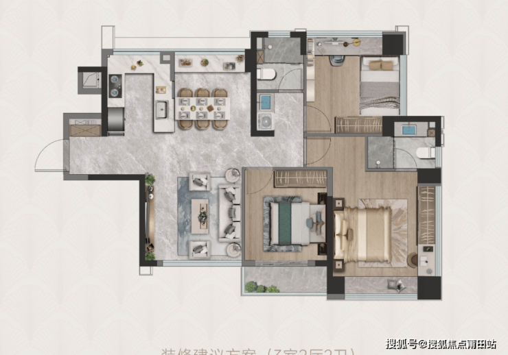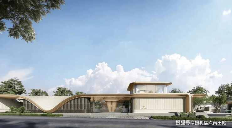 外立面:米黄色大理石+深色大理石+香槟色铝板+通透玻璃幕墙,造型上采用超流体全面屏立面与270°环幕视野飘窗。