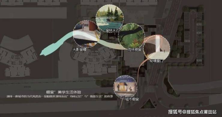 项目分以循迹窗口为线索,提炼出「城市橱窗、秘境窗口、雨林橱窗、窗林水石、光影窗幔」五大场景,每个区域都展现着独特的设计理念并传递出生态自然的居住氛围。