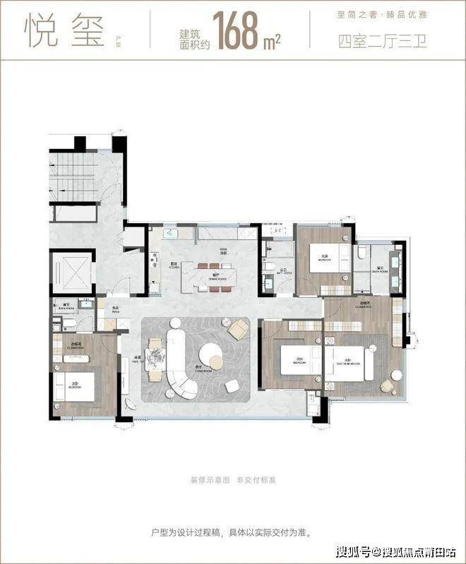 其中168㎡户型采用双主卧套房设计,配备独立电梯厅,私密性与舒适性兼具。