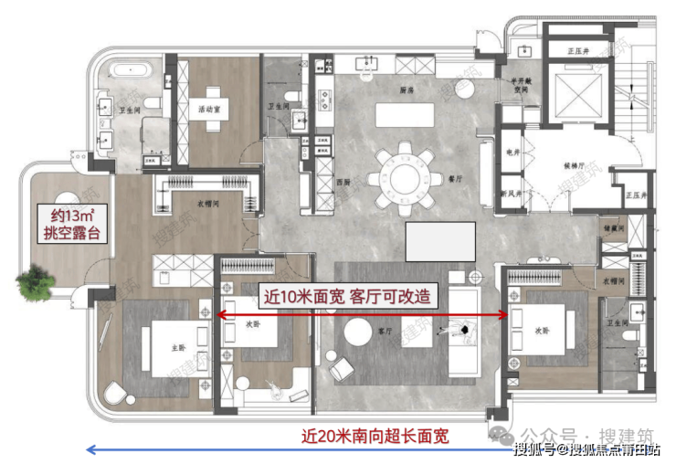 在南京瑞玺的同面积户型中,在全景舱基础上叠加洄游动线与立面创新。