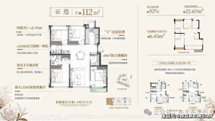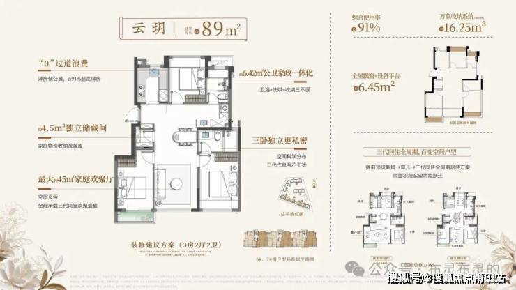 建发璞云主力户型82-113㎡,大胆的纯洋房设计+全飘窗、设备阳台赠送,让综合使用率十分惊艳: