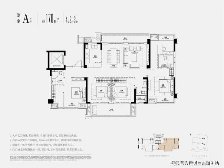 产品设计创新:高窗墙比、南北双大阳台、得房率高(170㎡户型达96%)