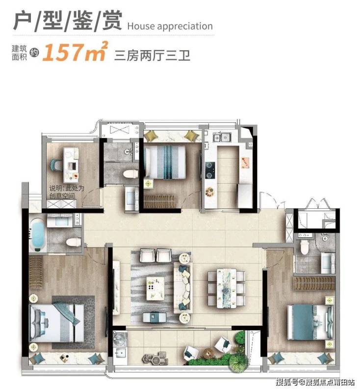 建筑面积约157㎡户型,客餐厅超35㎡,南向开间更是拉大至约7米,敞亮通透,成为家人最喜欢的空间,装下多种美好生活场景。