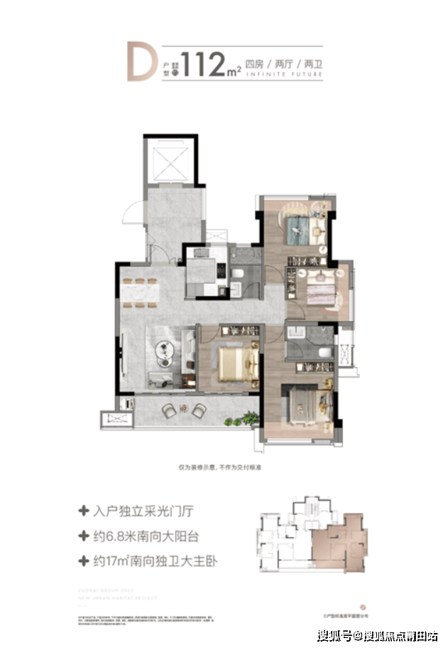 D户型建筑面积112平方米,为一梯一户产品,私密性更强,拓展空间更高。最大赠送约7.8㎡入户门厅,得房率达92%,这种产品一般只有大平层才能做到。四房两厅两卫的设计,每个家庭成员都有自己的独立空间,可轻松满足了三代同堂的置业需求。