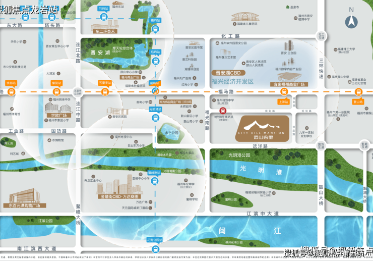 三远片区位于晋安东区,是福州市近期启动的连片旧屋区改造重点项目。片区交通配套成熟,北侧是地铁2号线上洋站,第三轮地铁8号线拟从片区内部穿过并设置三远站。项目南侧是光明港及光明港公园,具有良好的面河景观,周边生活配套有宜家商业综合体、格致中学鼓山校区、鼓山苑小学等。