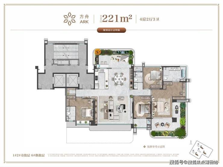 亮点在于偶数层户型做到了南北双露台,南向主卧与270°空中花园无界联通,轻松实现“私家花园+独立衣帽间+休息区+酒店式卫浴”四大功能配置,让居家日常也能有酒店式度假感。北向阳台与客厅、餐厅一体衔接,实现LDKG一体化设计,提升空间利用率。