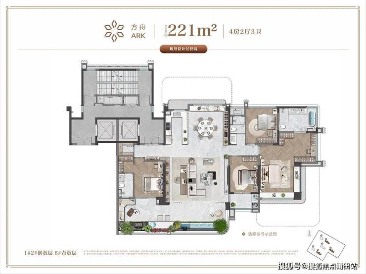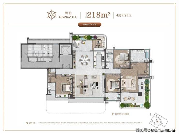 4+1室2厅3卫,约3.3米层高,同样做到类独梯入户,提升归家的仪式感。