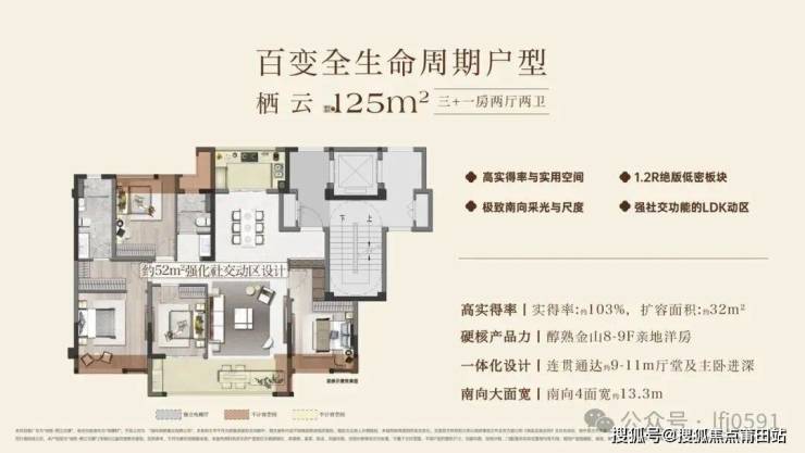 125平米的户型为3+1房,四开间朝南,可根据需求选择四房还是三房户型,从户型图里可以看到,即使做四房,空间还是很阔绰,餐客厅为南北通透,为全明结构的3+1户型。