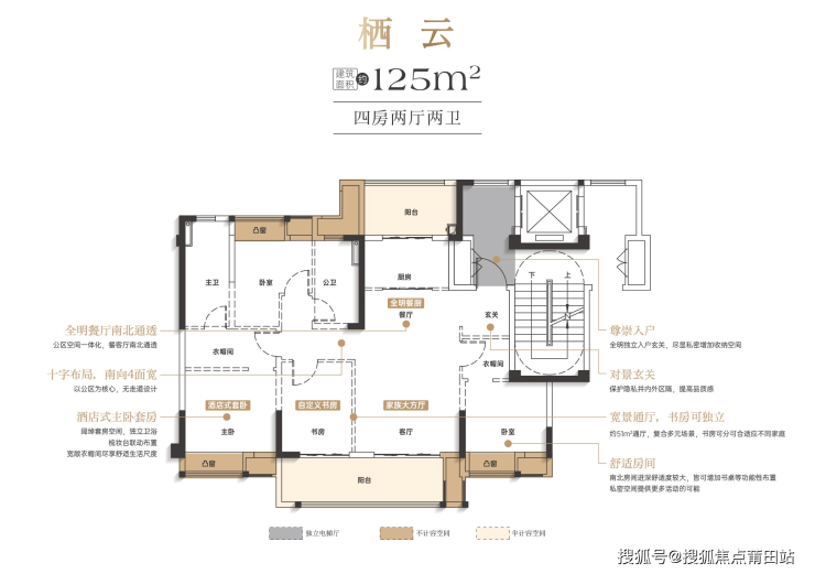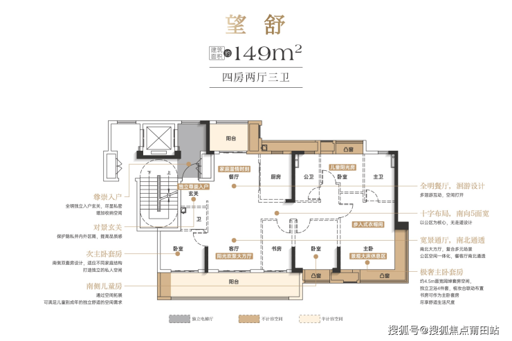 亮点:一梯两户双开门设计,相当于“独梯入户”。四开间朝南,面宽达约13.3米,采光极佳。得益于低密,得房率据说高达103%-105% ,上演了“公摊消失术”。