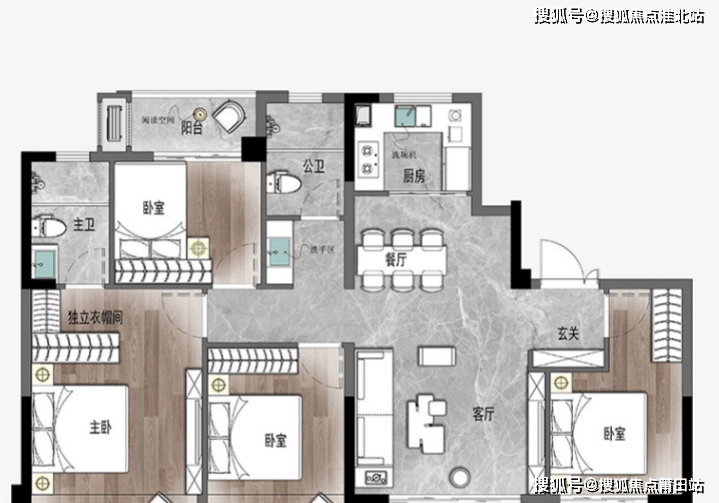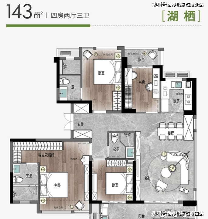 和126㎡同一栋楼,端厅设计,客厅东面大落地窗,南面连接双面宽阳台,形成超大采光面,同时还能一线观景,视觉体验直接拉满。143㎡做到了三卫,目前市面上比较少,不过遗憾的是公卫做成了暗卫。