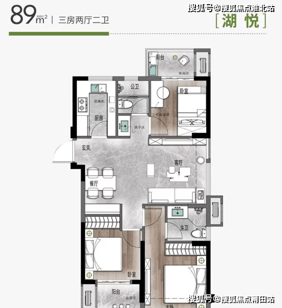 和89㎡主要区别在于餐客厅连接了一个东侧观景大阳台+北侧多了个小房间,舒适度更高一些。