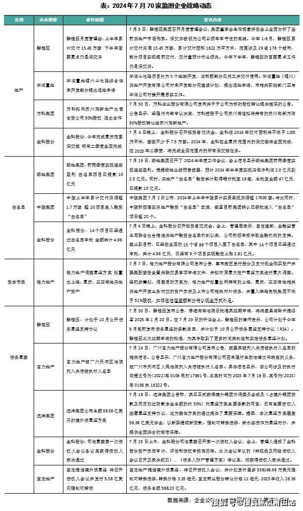 3、在债务重组方面,7月25日,金科股份司法重整召开第一次债权人会议,会上,管理人通报了金科股份资产负债审计、评估和债权申报情况等。此次会议审议多部议案,均获得债权人表决通过。7月30日,碧桂园发布公告,香港高等法院已批准其延期申请,将清盘呈请聆讯推迟至2025年1月20日。碧桂园律师表示,此次延期申请的批准,为其争取到了更多时间来制定和实施债务重组计划。而此前已完成债务重组的富力地产,据7月24日公告显示,广州富力地产股份有限公司因未履行生效法律文书确定的义务,被广州市天河区人民法院列入失信被执行人名单。