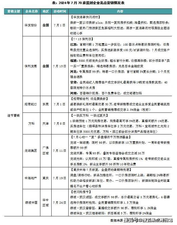 1、本月房企营销活动主题多围绕、“盛夏”、“奥运”、“夜购”等关键词,从营销方式上看以特价房、折扣等“以价换量”的方式为主。根据CRIC监测情况看,保利发展、华发股份举办了集团营销活动,其中保利发展“7.15保利日”在全国范围内举办活动,华发股份举办“消暑快闪派对”,同时绿城华中区域推出“夜闪购房节”、金地中西部区域举办“燃情奥运购房季”等营销活动。