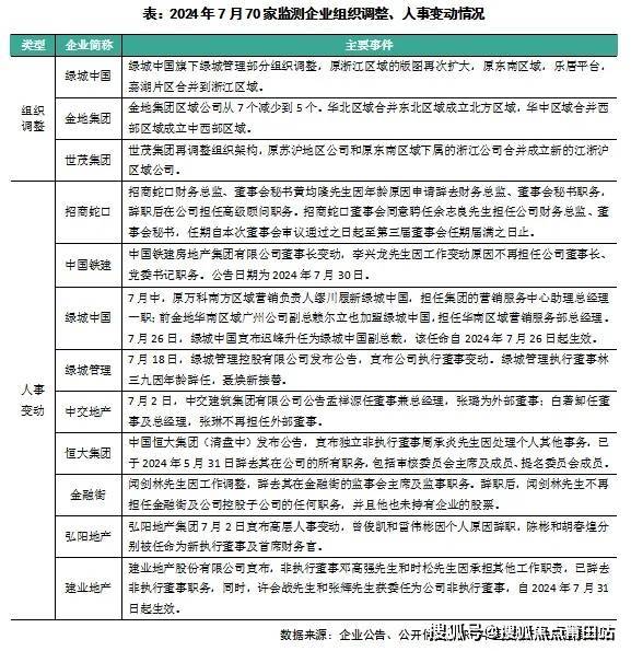 2024年7月,70家重点监测房企重大人事变动及组织调整如下: