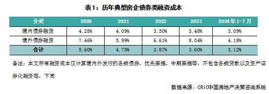 2、融资成本:2024年1-7月65家典型房企新增债券类融资成本3.12%,较2023年全年下降0.48个百分点,其中境外债券融资成本4.18%,较2023年全年降低3.86个百分点,境内债券融资成本3.09%,较2023年全年降低0.39个百分点。单月来看,7月房企融资成本为2.85%,环比降低了0.41pct,同比降低0.67pct。本月境外方面仅有越秀地产发行了一笔利率为4.1%的16.9亿元绿色优先票据,而由于境内发债的企业仍然主要是首开、金隅、保利置业等央企国企,因此境内融资成本仍然保持在较低的水平。