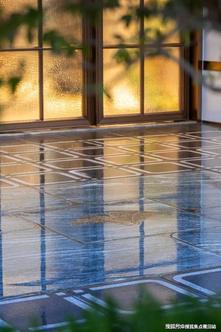 单单社区大门主入口,就用了一整面巴西雪山蓝奢石+金属铝雕格栅构成背景墙,还有卢浮宫同款的贝金米黄大理石和挪威的神秘宝石“蓝珍珠”,连业主不敏感的地面都用库斑绿石材铺装,妥妥的降维增配!