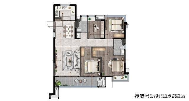 95平米:三房两厅两卫,位于中户,三开间朝南,市面主流布局,优势在于主卧搭配L型衣柜,同时搭配了宽阳台,劣势在于北面存在隐私问题,同时北面卧室较小。