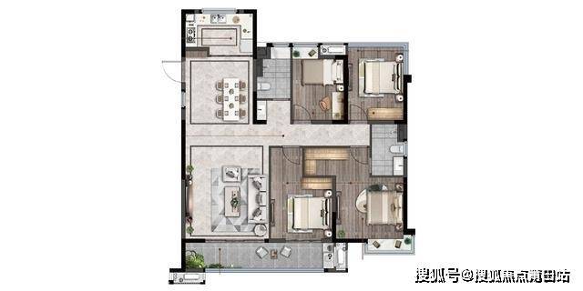 145平米:四房两厅两卫,位于端头,与125户型布局一致,差异在于面宽加大,北侧书房变成了卧室,对于145的产品,目前市场不少都走大面宽,相比而言该布局也只能算中规中矩。