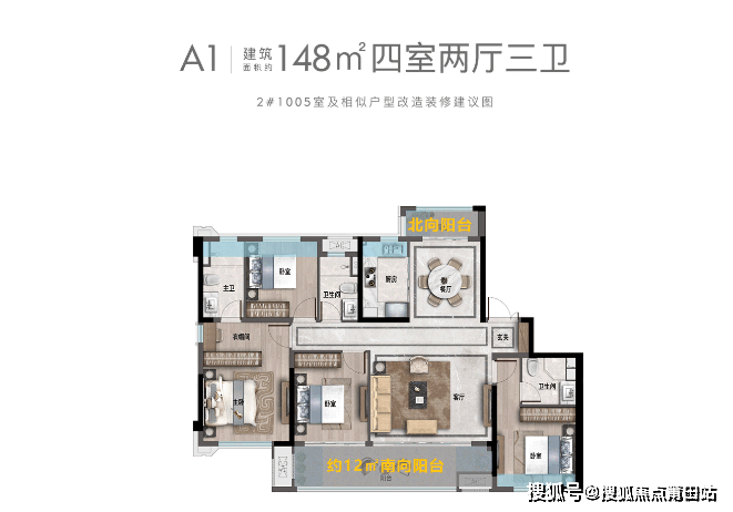 福清在售新楼盘仅有的南北双阳台(部分户型)。南向约12㎡观景台连接会客厅,揽观音埔盛景;北向大阳台居家晾晒,生活、景观明确分区。
