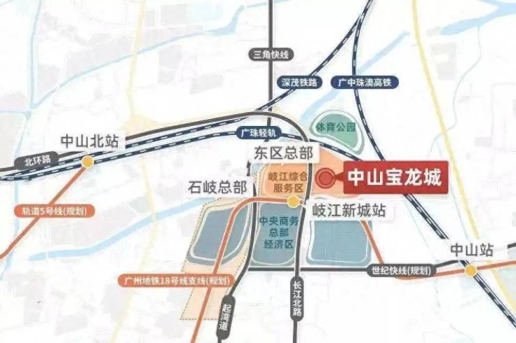 值得一提的是,中山宝龙城位于岐江新城规划片区核心地段,距广珠城轨中山站直线距离2.3km,距中山北站直线距离3.2km,交通便利。用地南临濠江西路,西临长江路,两道主干道分别通达广澳高速与三角快线,