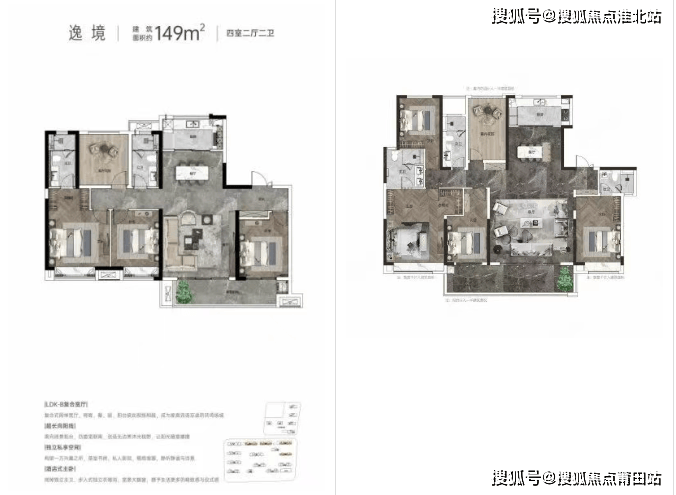 建面约 149㎡四房两厅两卫:两梯两户纯板楼,私梯入户,尊享大平层级生活居住体验。采用 LDKB 一体化竖厅及四面宽朝南设计,南向面宽达到约 14.3 米,采光通风效果佳。